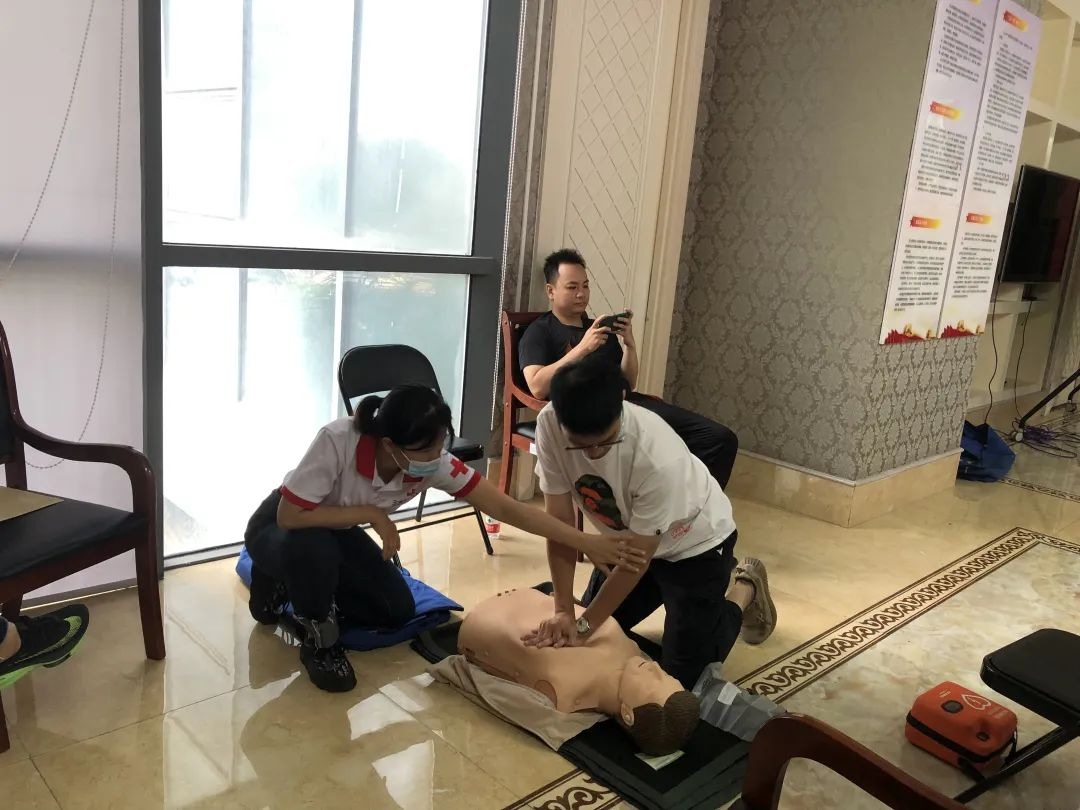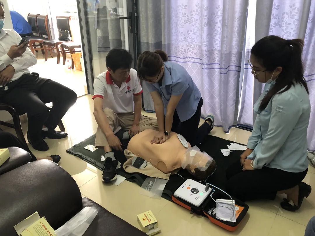 培训以理论知识讲授、技能实际操作相结合的方式,主要讲授心肺复苏(CPR)、自动体外除颤仪(AED)等常见突发事件急救方法的基本操作步骤。培训老师通过模拟人进行了心肺复苏、AED使用等内容现场演示,并结合操作步骤的细致分解,对学员实际操作进行逐一指导。