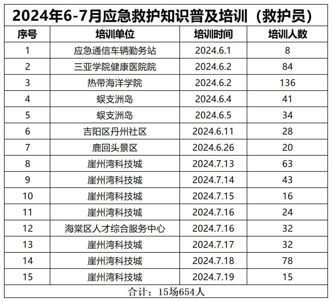 2024年6-7月,中共三亚市红十字应急救援中心联合支部委员持续在全市开展"红心守护 救在身边"党建品牌2024年应急救护知识普及培训系列活动,扎实推动党建与业务深度融合。6-7月份共开展红十字应急救护培训39…
