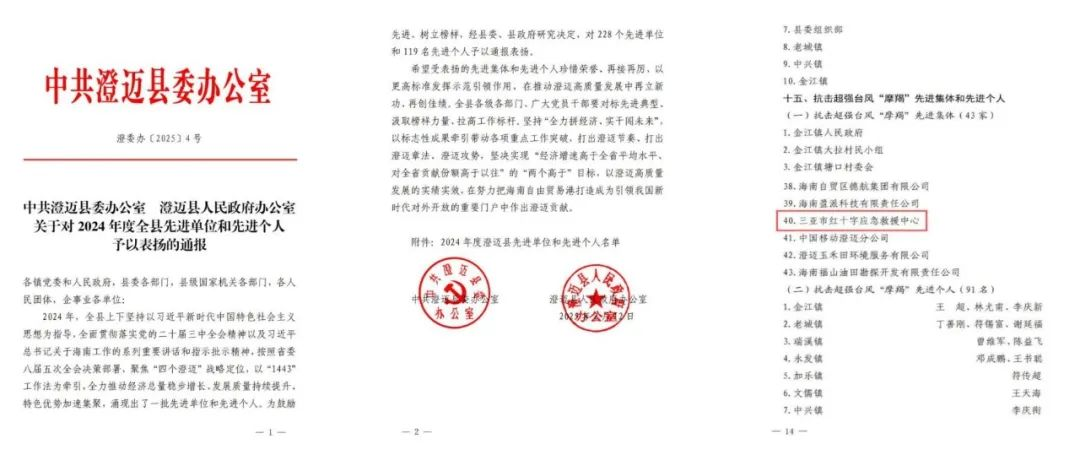 2025年2月14日,三亚市红十字应急救援中心在抗击超强台风“摩羯”中,以卓越的表现,荣获澄迈县委、县政府颁发的抗击超强台风“摩羯”先进集体荣誉称号。在此次抗击超强台风“摩羯”的救援行动中,根据澄迈县委、县政…