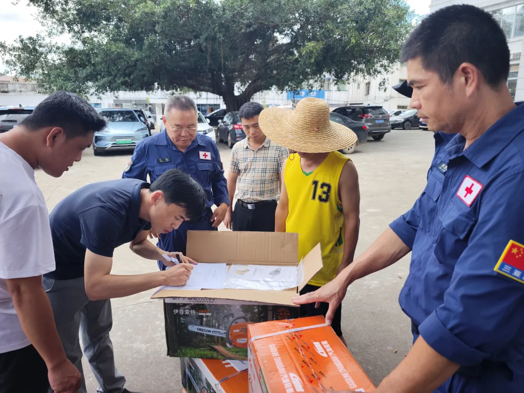 9月12日,三亚市红十字应急救援中心在完成华能供热管道清障任务后,派出8人3车,在澄迈县应急局工作人员的带路下,为澄迈县大丰镇安丰社区、中兴镇中兴社区、仁兴镇吴案村、加乐镇加桐村、文儒镇文丰村、瑞溪镇山琼村等受灾严重、清障装备匮乏的村庄发放机动链锯100台,为受灾严重的村庄恢复正常生产生活提供了有力的支持。