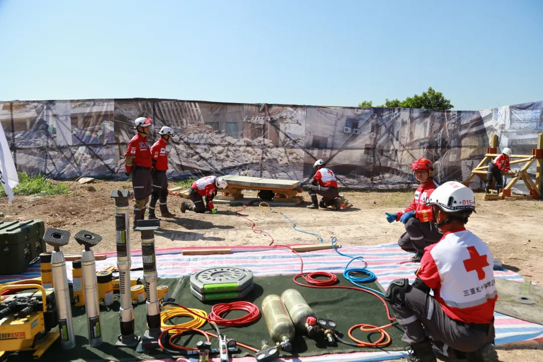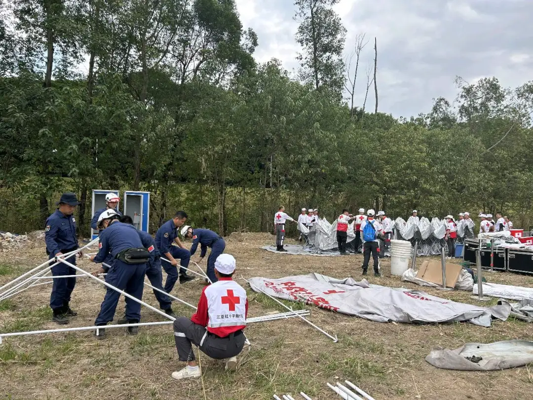 本次演练,救援中心参与了理论培训、水上救援、坍塌救援、营地设置、供餐保障等演练科目。