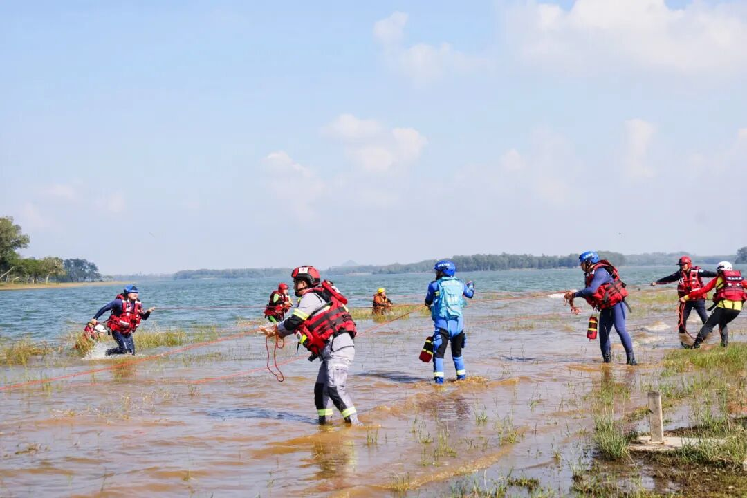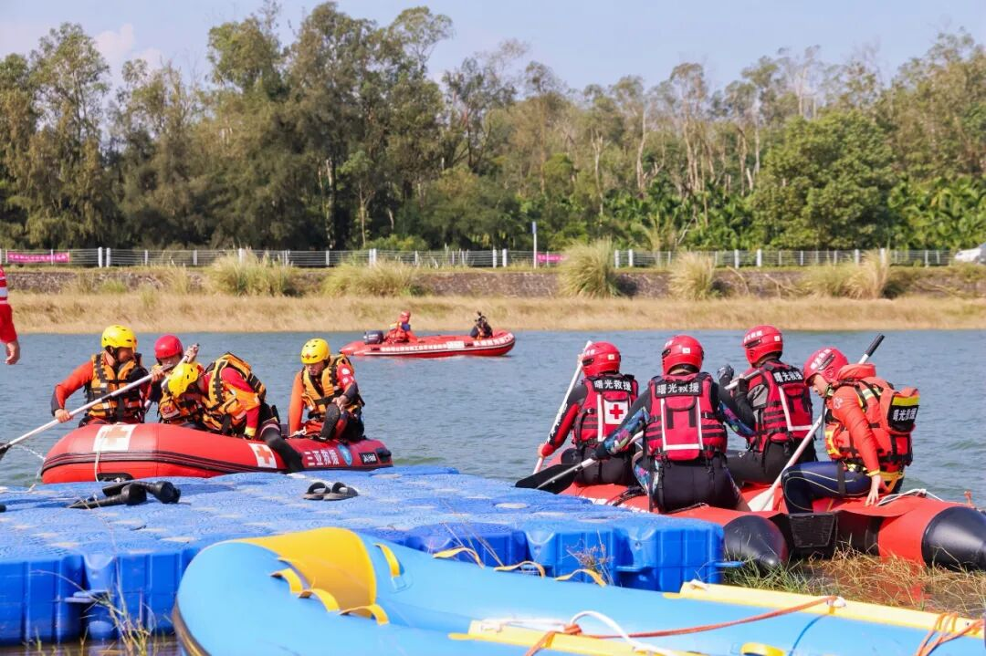 水域救援演练:转移被困群众、抛绳包救援、抛绳器救援、快速向心力安全救援、翻舟自救等。