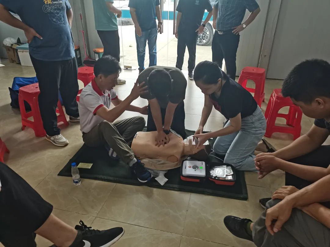 在中交集团项目部培训中,主要通过线上授课教学、线下模型演练的方式进行。实操带教老师针对心肺复苏、AED使用、创伤救护等操作进行了讲解和示范,并指导员工进行模拟操作。在理论+模拟操作演练的过程中,让大家能够有效把握住“黄金4分钟”抢救关键期。通过此次培训,该项目部员工更深入了解应急救护的概念及相关知识,掌握基本的急救技能,进一步强化了现场作业人员的应急自救和互救能力,为该项目安全施工夯实了基础。