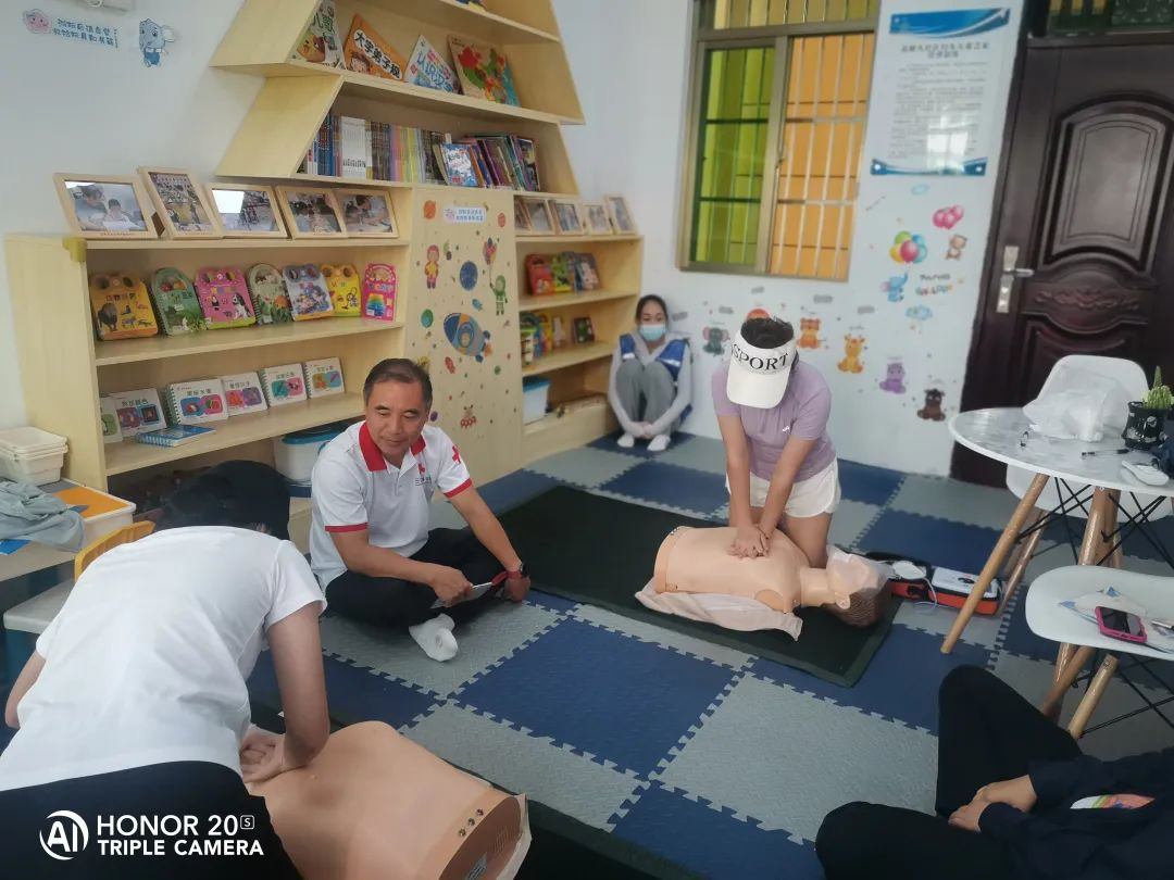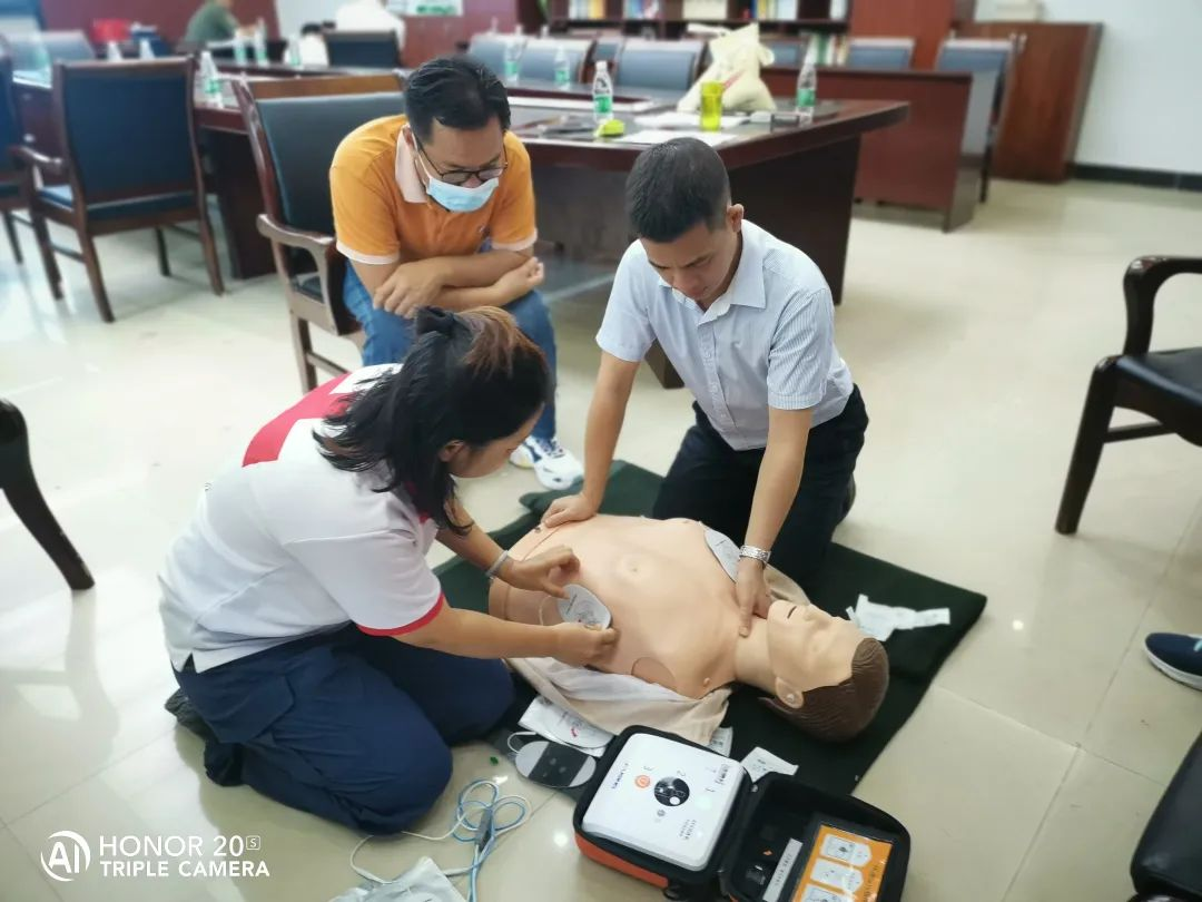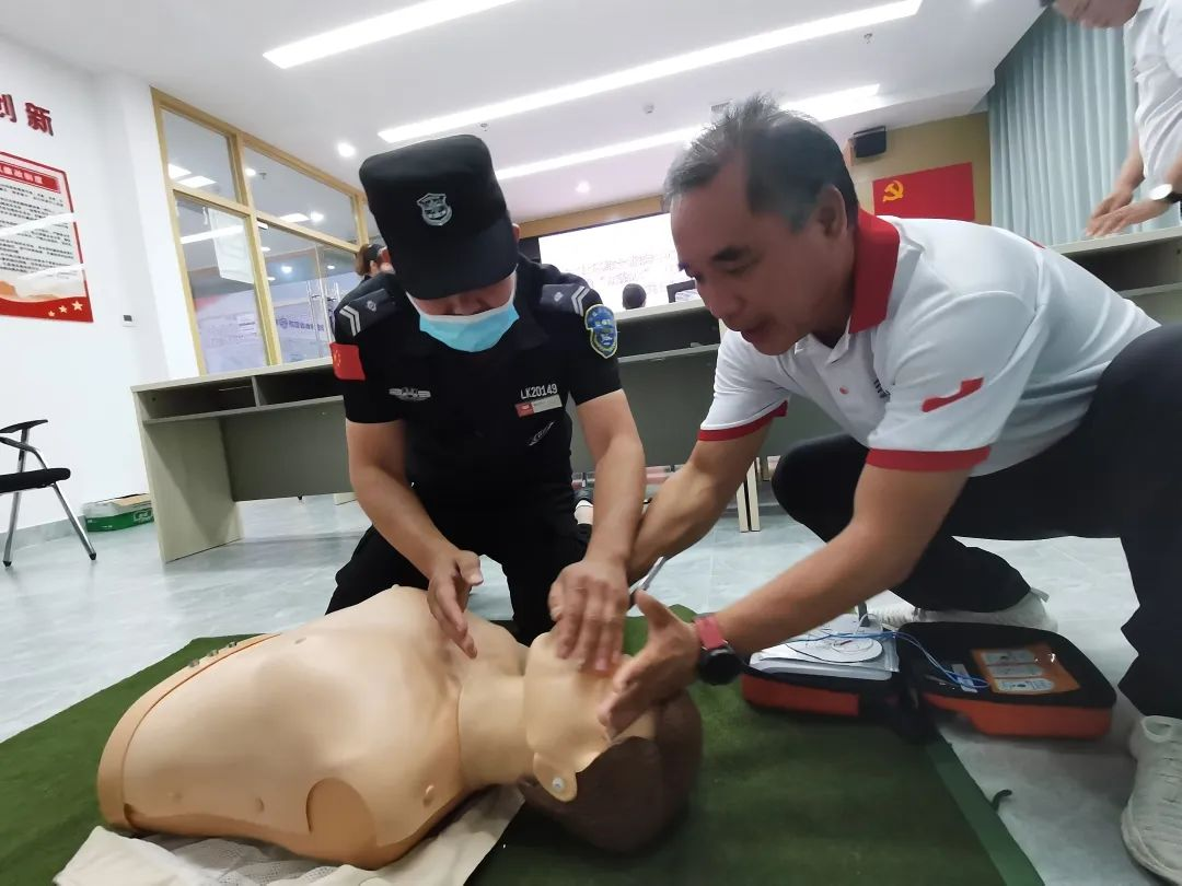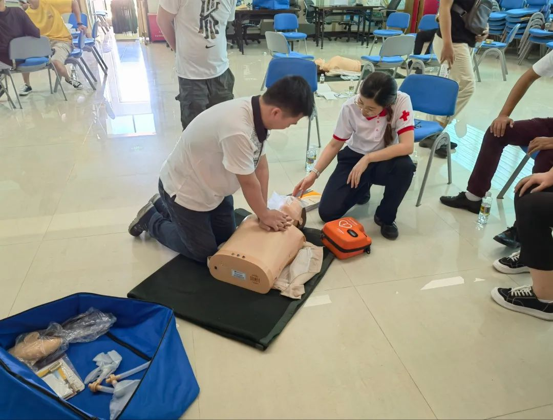 培训现场,老师围绕心肺复苏、AED使用和创伤救护等内容进行授课讲解。内容包括急救前的环境评估,现场施救应该注意的事项及规范等急救操作程序,通过“线上理论+线下操作”相结合的形式,让学员系统全面地学习救护知识和急救技能。